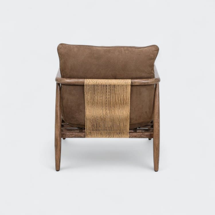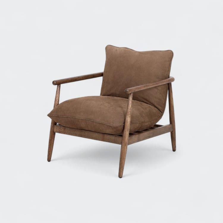כורסת עור נובוק איכותית בשילוב עץ אלון בגוון אגוז וחוטים.
