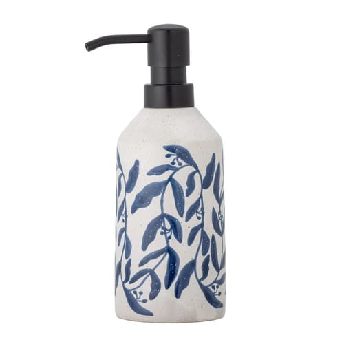 דיספנסר Aurora של Bloomingville עשוי מאבן קרמיקה איכותית ומצויר בעבודת יד עם דוגמה פרחונית כחולה על רקע בהיר.