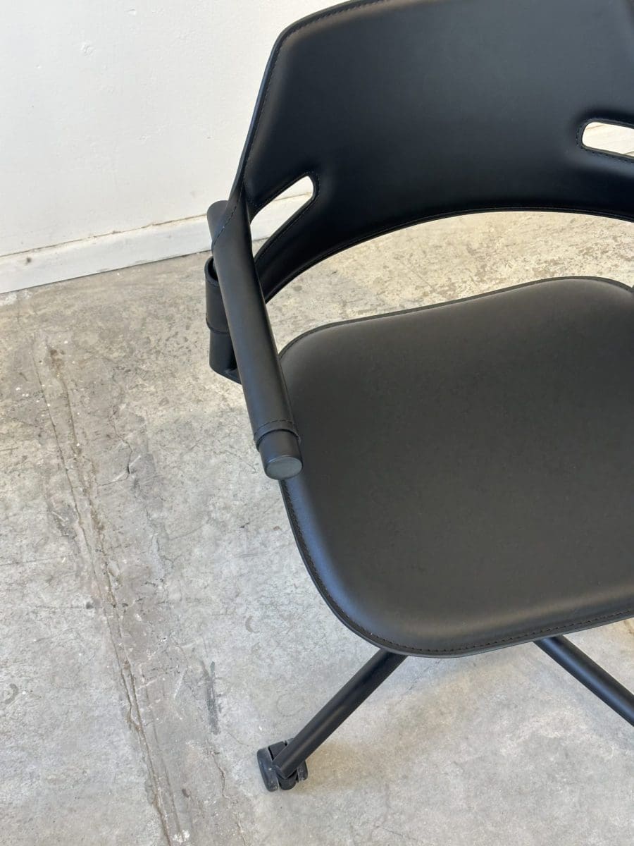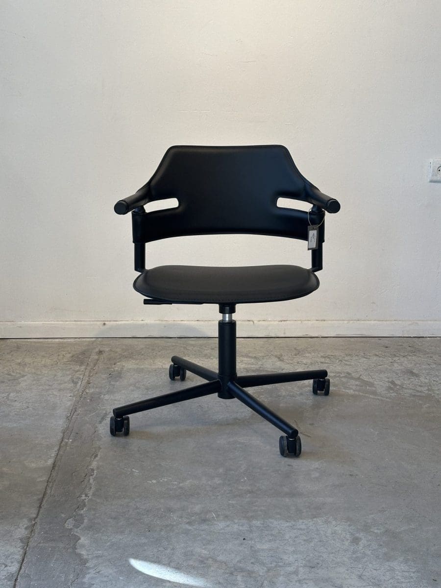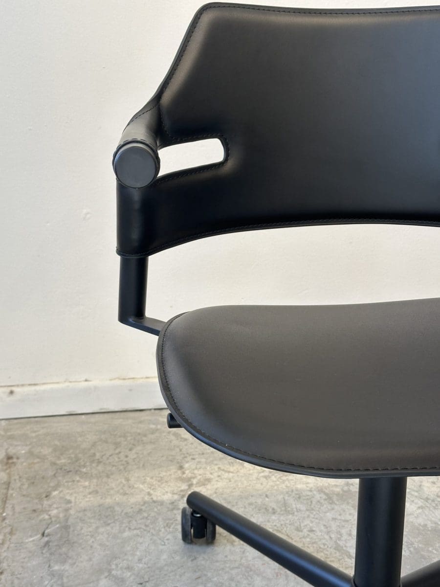 כיסא משרד איכותי בצבע שחור, עם מושב וברכיים מרופדים וסגנון מודרני ונוח. אידיאלי לעמדת עבודה מתמשכת, משלב תמיכה ארגונומית עם מראה אלגנטי שמתאים לכל משרד או חלל עבודה.