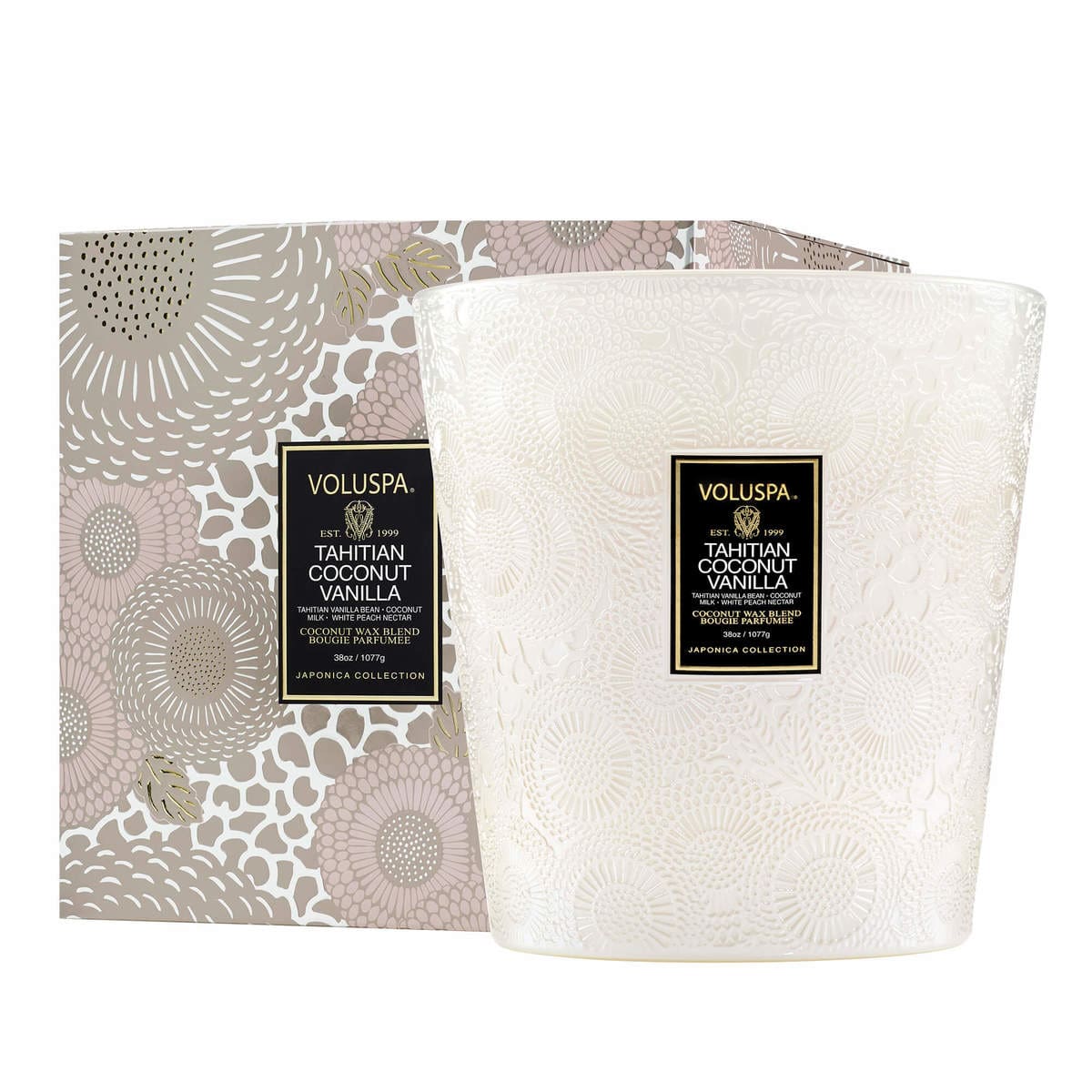 נר בניחוח Tahitian Coconut Vanilla מסדרת JAPONICA, נר ריחני סופר איכותי, ארוז בכלי יפיפה של Voluspa.