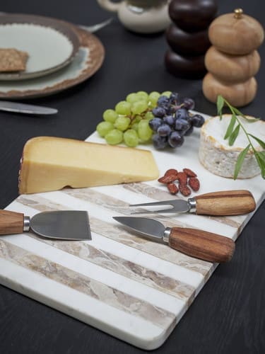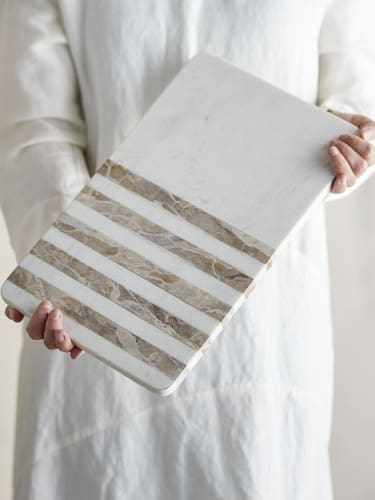 קרש ההגשה Novelle מבית Bloomingville מביא אלגנטיות קלאסית לשולחן שלך. עשוי שיש טבעי בגוונים בהירים ומעוטר בפסים עדינים המעניקים לו מראה מינימליסטי ומתוחכם. הקרש מושלם להגשה יוקרתית של גבינות או פירות, וגם לחיתוך. כמוצר טבעי, כל קרש הנובל הוא יחיד ומיוחד בזכות הווריאציות הטבעיות בשיש, ומבטיח פריט אבזור בלעדי למטבח.